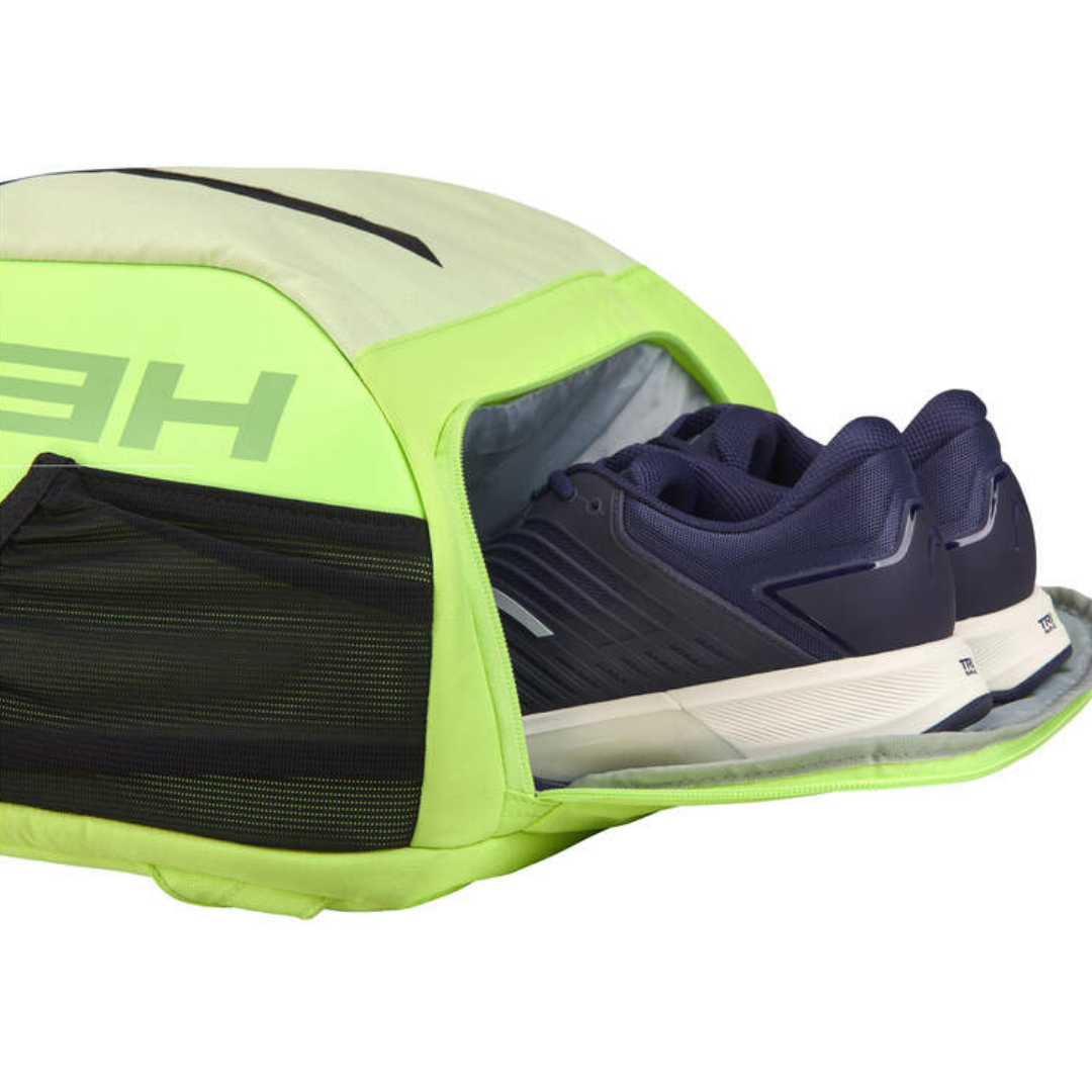 Мягкое отделение для ракеток надежно вмещает до двух ракеток, защищая их от повреждений во время транспортировки. Просторное основное отделение предлагает место для обуви, одежды и другого снаряжения, а многочисленные карманы для аксессуаров обеспечивают организованное хранение мелких предметов, таких как рукоятки, ключи и кошельки. Встроенное вентилируемое отделение для обуви гарантирует, что ваши вещи останутся свежими и организованными.